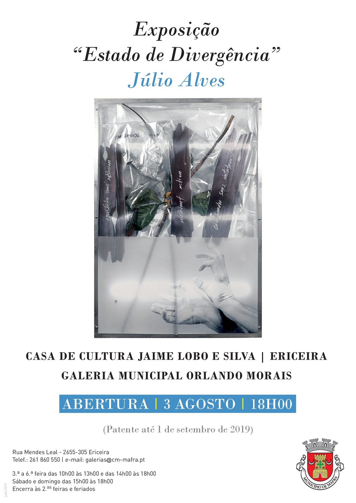 Adicionar a calendário2019-08-03 00:00:002019-09-01 00:00:00Europe/LisbonExposição "Estado de Divergência", de Júlio AlvesGaleria Municipal Orlando Morais, Casa de Cultura Jaime Lobo e Silva - Ericeira
