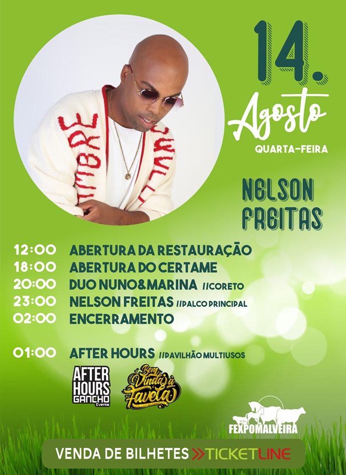 12h00 - Abertura da restauração18h00 - Abertura do certame20h00 - Duo Nuno & Marina | Coreto23h00 - Nelson Freitas | Palco Principal01h00 - After Hours | Pavilhão Multiusos02h00 - Encerramento