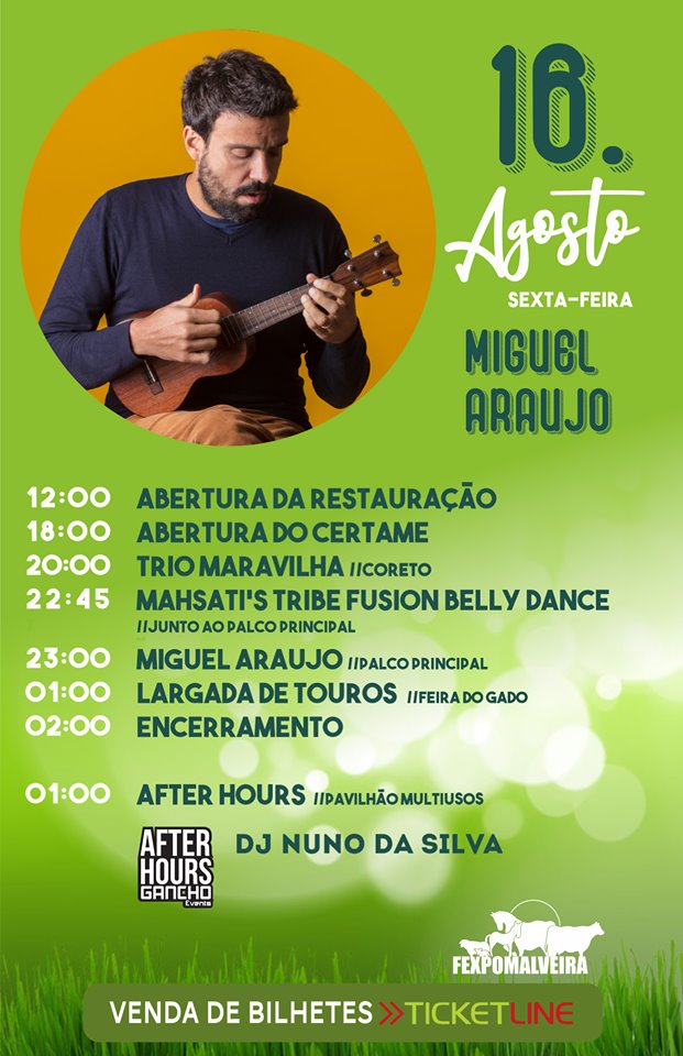 12h00 - Abertura da restauração18h00 - Abertura do certame20h00 - Trio Maravilha | Coreto22h45 - Mahsati's Tribe Fusion Belly Dance | Junto ao Palco Principal23h00 - Miguel Araújo | Palco Principal01h00 - Largada de Touros | Feira do Gado01h00 - After Hours | Pavilhão Multiusos02h00 - Encerramento