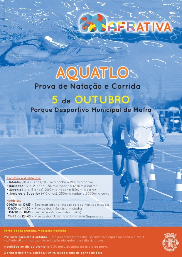 Pré-inscrição até 4 de outubro, junto dos professores das Piscinas Municipais ou para o e-mail: mafrativa@cm-mafra.pt. Acreditação obrigatória no dia da prova.
