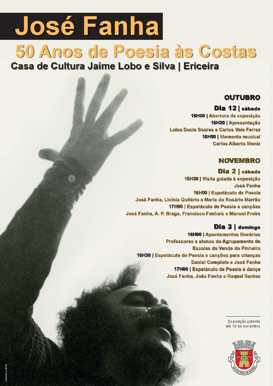 Adicionar a calendário2019-11-03 00:00:002019-11-03 00:00:00Europe/LisbonJosé Fanha "50 Anos de Poesia às Costas"Casa de Cultura Jaime Lobo e Silva - Ericeira