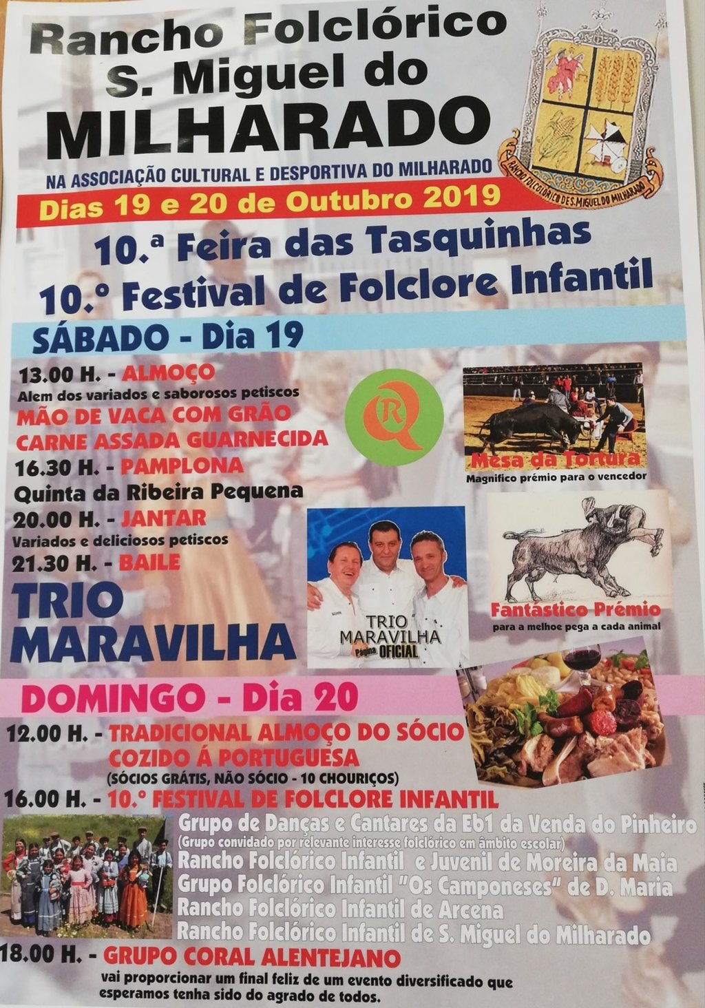 Adicionar a calendário2019-10-19 00:00:002019-10-20 00:00:00Europe/Lisbon10.ª Feira das Tasquinhas | 10.º Festival de Folclore InfantilAssociação Cultural e Desportiva do MilharadoRancho Folclórico S. Miguel do Milharado