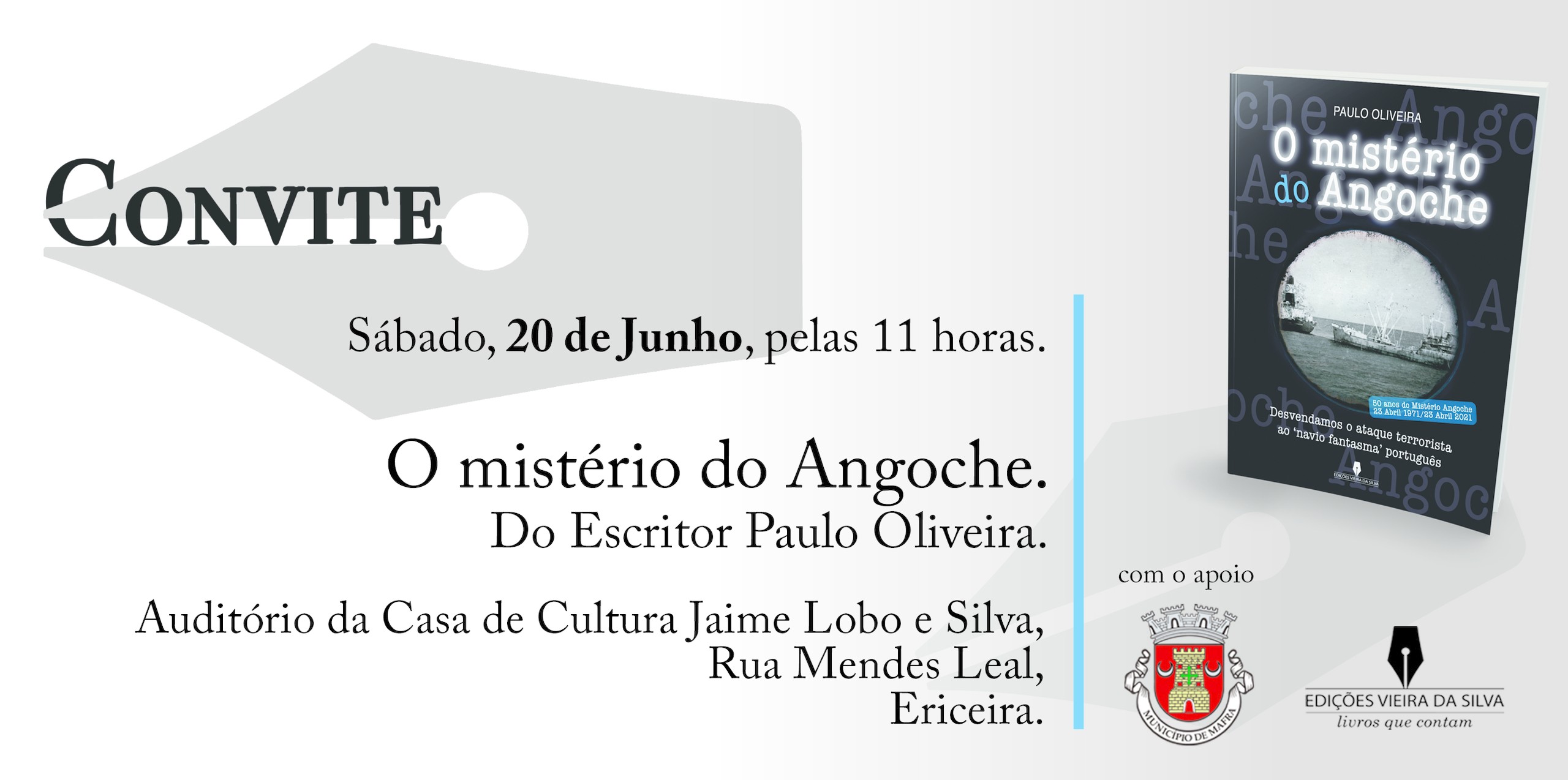 Adicionar a calendário2021-06-20 00:00:002021-06-20 00:00:00Europe/LisbonLançamento do Livro "Mistério do Angoche", de Paulo OliveiraAuditório da Casa de Cultura Jaime Lobo e Silva - Ericeira