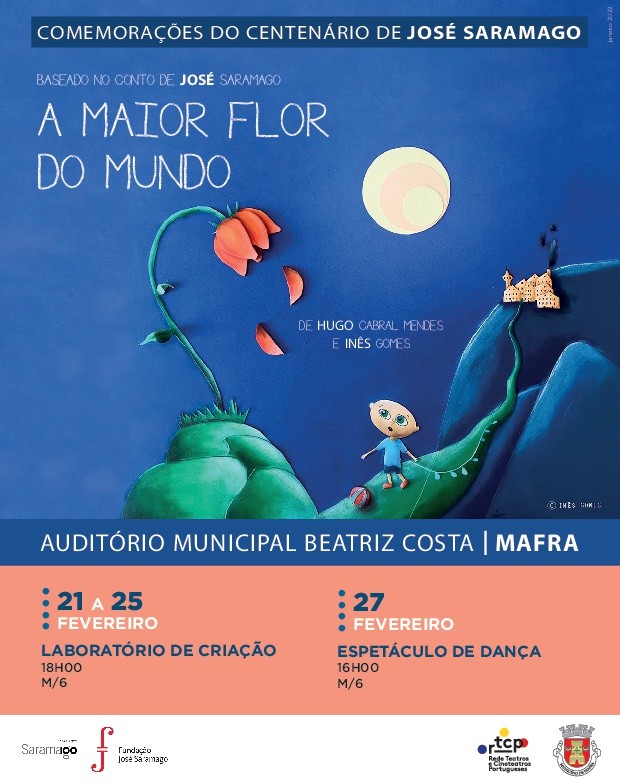 Adicionar a calendário2022-02-21 00:00:002022-02-25 00:00:00Europe/LisbonComemorações do Centenário de José Saramago "Laboratório de Criação"O acesso aos eventos está condicionado ao cumprimento, por parte do público, das medidas sanitárias em vigor definidas pela Direção-Geral de Saúde.Auditório Municipal Beatriz Costa - Mafra