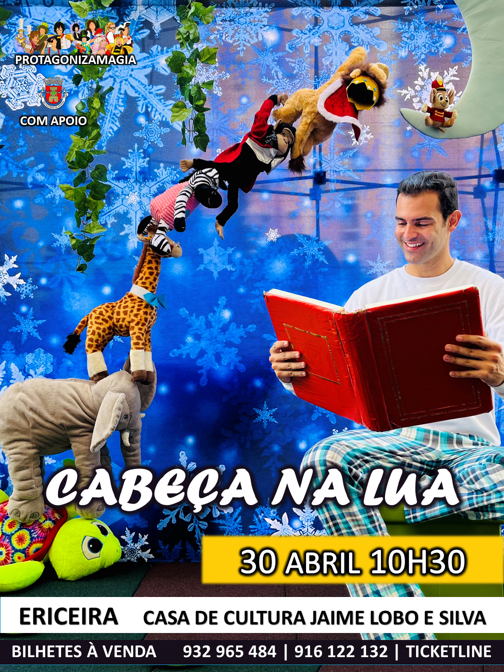 Adicionar a calendário2022-04-30 00:00:002022-04-30 00:00:00Europe/LisbonTeatro Infantil "Cabeça na Lua"O acesso aos eventos está condicionado ao cumprimento, por parte do público, das medidas sanitárias em vigor definidas pela Direção-Geral de Saúde.Auditório da Casa de Cultura Jaime Lobo e Silva - EriceiraProtagonizaMagia
