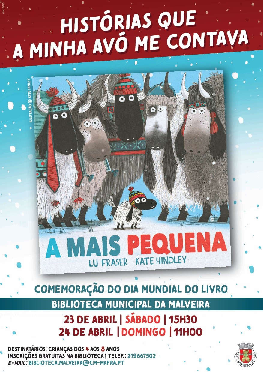 Adicionar a calendário2022-04-23 00:00:002022-04-23 00:00:00Europe/LisbonHistórias que a minha avó me contava "A mais pequena"O acesso aos eventos está condicionado ao cumprimento, por parte do público, das medidas sanitárias em vigor definidas pela Direção-Geral de Saúde.Biblioteca Municipal da Malveira