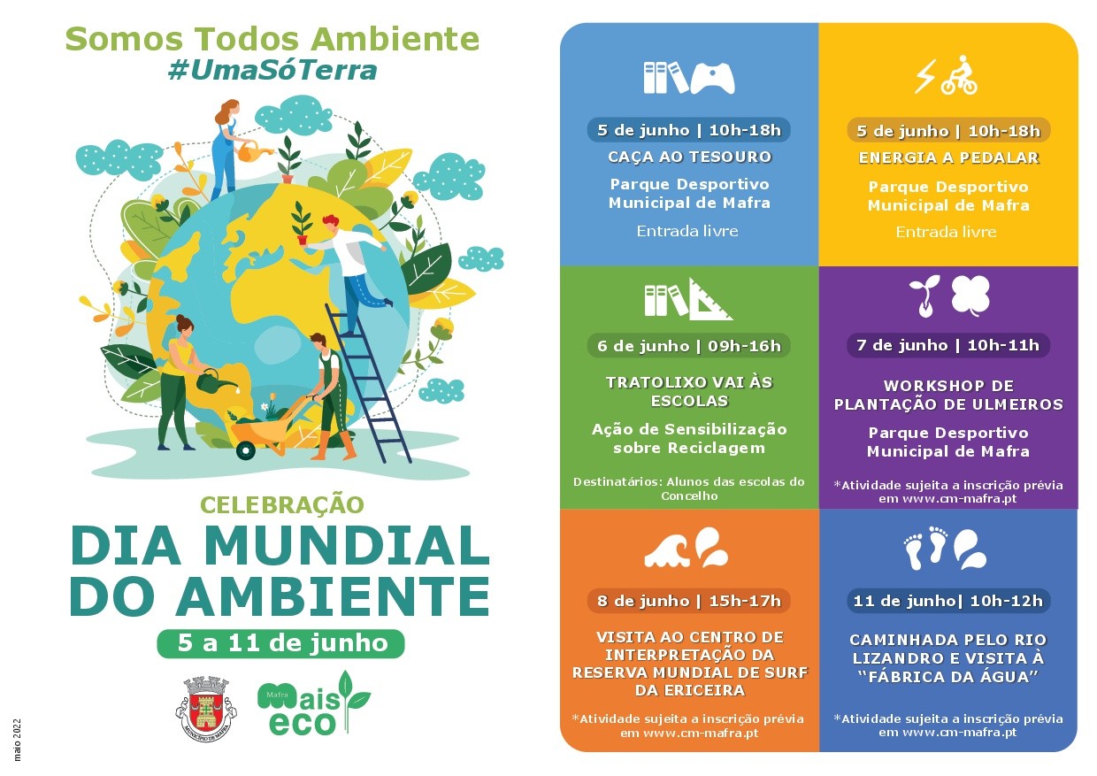 Para assinalar o Dia Mundial do Ambiente, comemorado a 5 de junho, a Câmara Municipal de Mafra promove a Semana do Ambiente, a decorrer entre os dias 5 e 11 de junho, no Parque Desportivo Municipal de Mafra e na Ericeira.