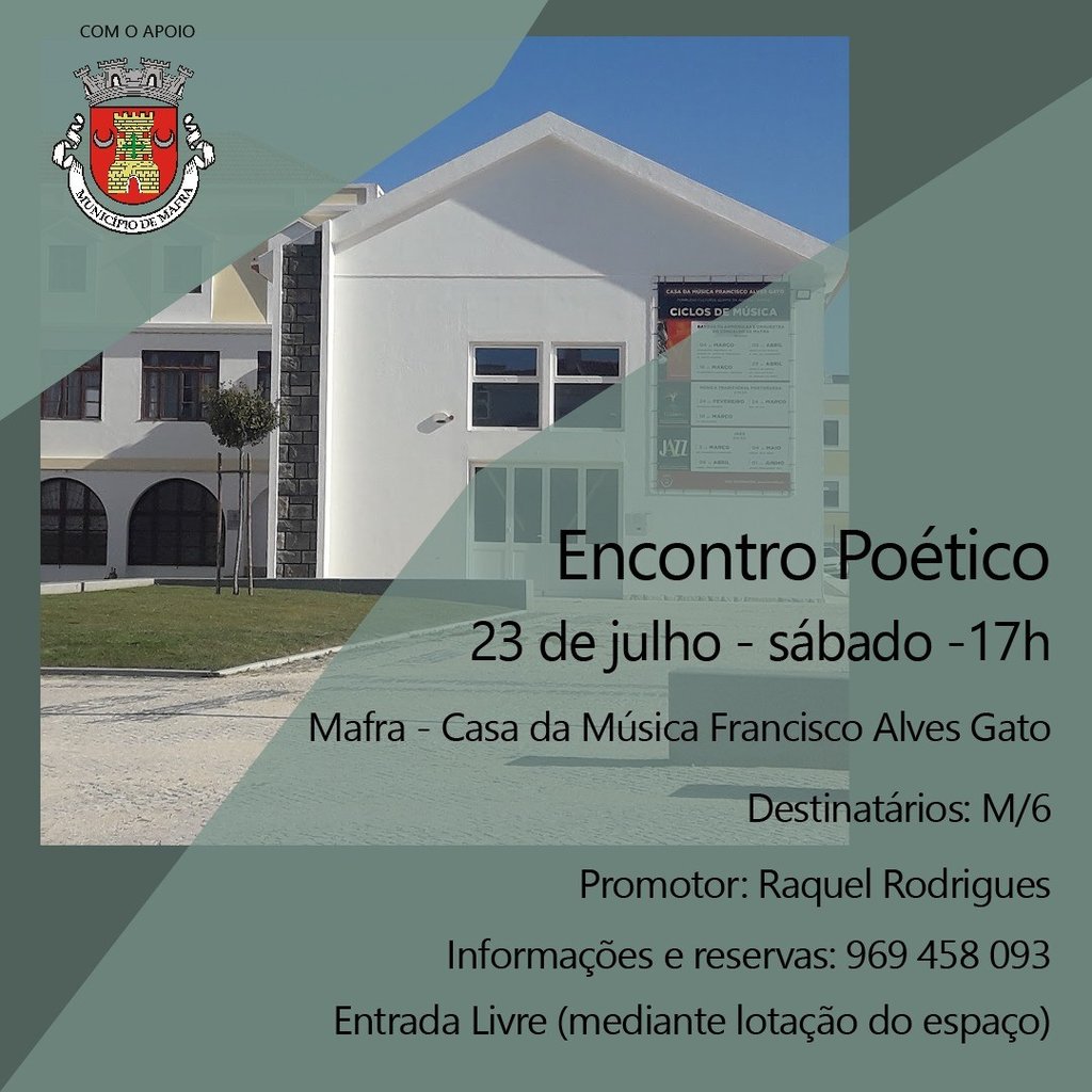 Adicionar a calendário2022-07-23 00:00:002022-07-23 00:00:00Europe/LisbonEncontro PoéticoAuditório da Casa da Música Francisco Alves Gato - MafraRaquel Rodrigues