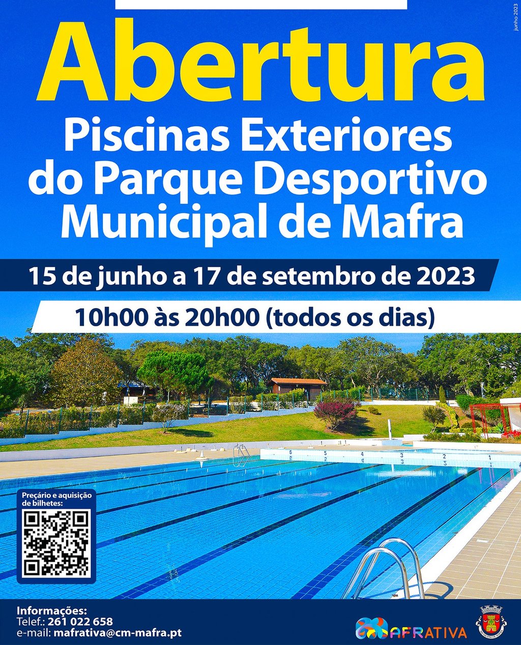 A venda de bilhetes de ingresso nas Piscinas Exteriores poderá ser efetuada online, através do endereço: https://desporto.cm-mafra.pt/bilheteira.php