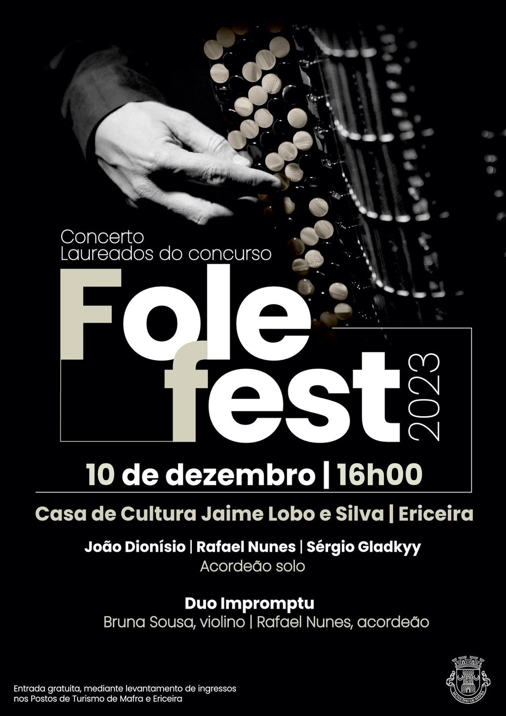 Adicionar a calendário2023-12-10 00:00:002023-12-10 00:00:00Europe/LisbonConcerto Laureados do Concurso "Folefest"Auditório da Casa de Cultura Jaime Lobo e Silva - Ericeira