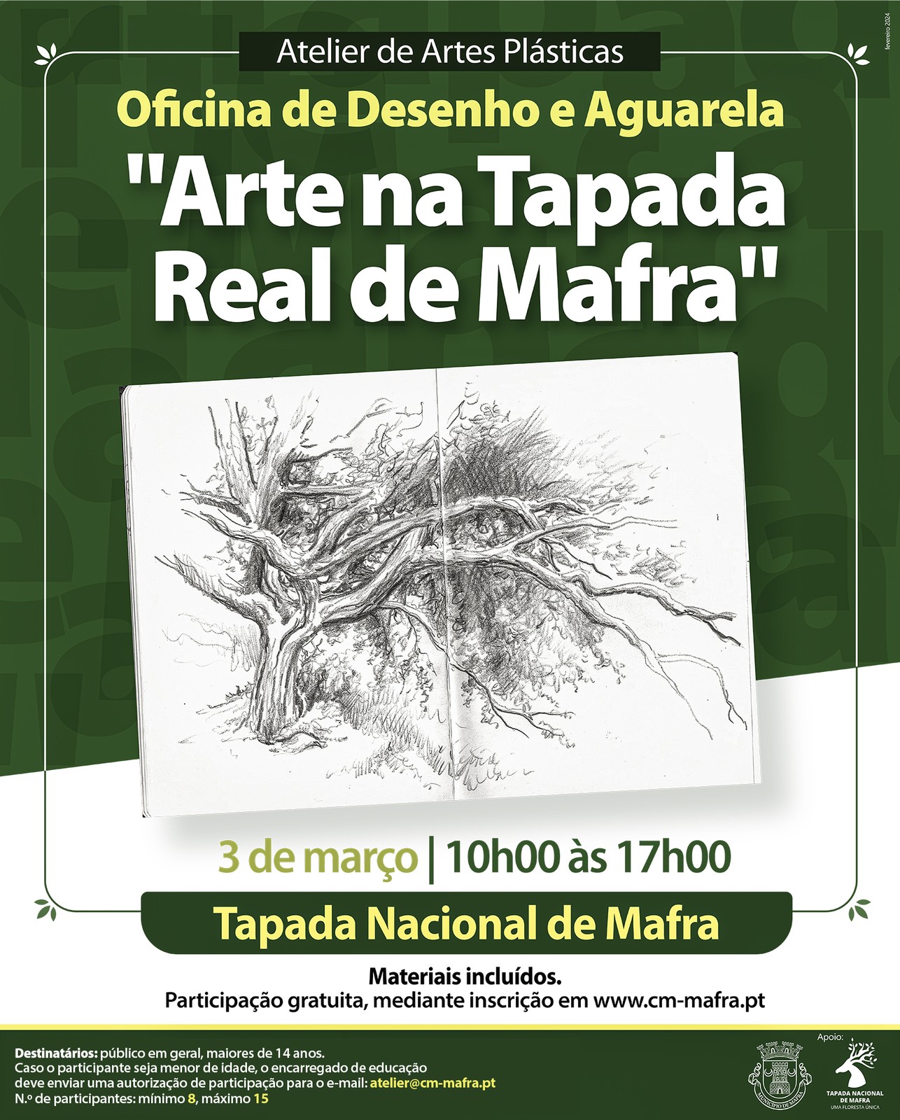 Adicionar a calendário2024-03-03 00:00:002024-03-03 00:00:00Europe/LisbonOficina de Desenho e Aguarela "Arte na Tapada Real de Mafra"ATIVIDADE ADIADA DEVIDO ÀS CONDIÇÕES ATMOSFÉRICASTapada Nacional de Mafra