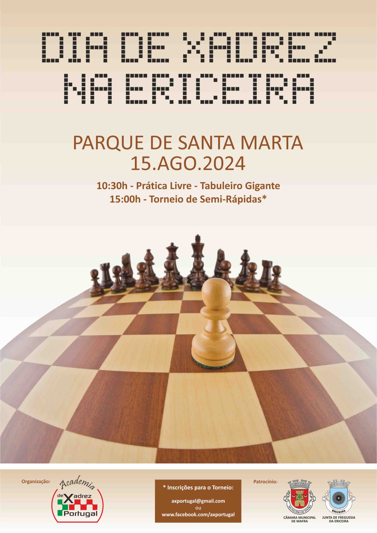10h30 - Prática Livre - Tabuleiro Gigante15h00 - Torneio de Semi-Rápidas