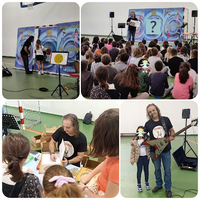 O escritor apresentou os seus livros, que fazem uma abordagem à arte clássica (música e artes plásticas) nas suas histórias e podem, igualmente, ser objetos úteis (como um espelho ou um relógio). Com a sua guitarra, o autor desafiou todos os alunos a cantar e a dançar as músicas da banda de GuruRock. Foi uma animação!